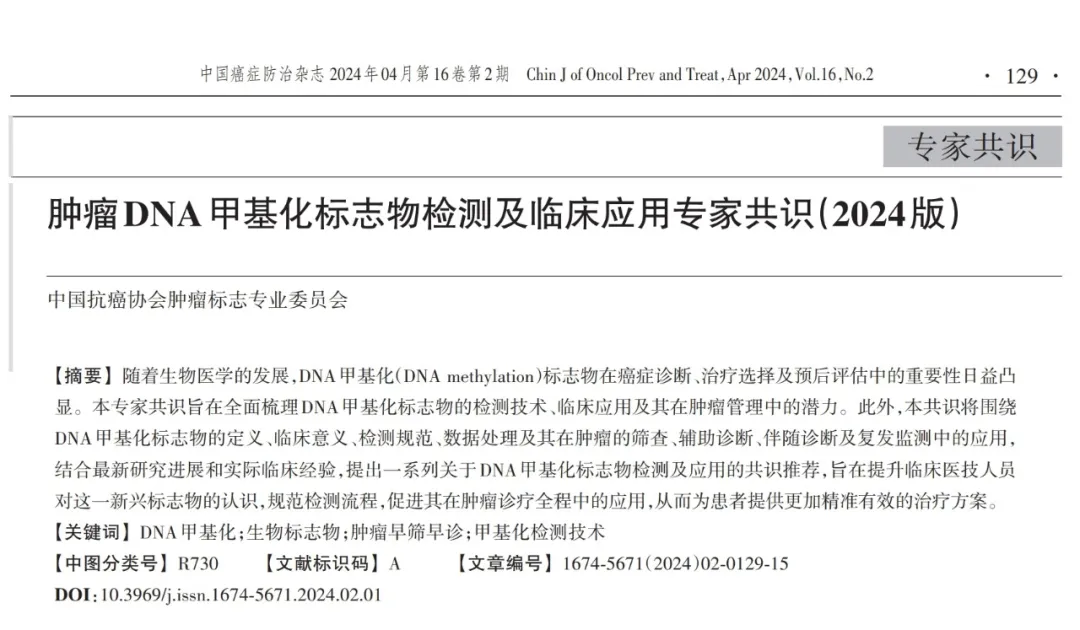 作为国内首个系统性介绍DNA甲基化标志物检测及临床应用的专家共识,中国抗癌协会肿瘤标志物专业委员会发布了《肿瘤DNA甲基化标志物检测及临床应用专家共识(2024版)》(以下简称《专家共识》),系统性介绍了DNA甲基化标志物在肿瘤筛查、辅助诊断、伴随诊断、复发监测和预后评估中的应用。其中,基于全癌标志物PCDHGB7、HIST1H4F、SIX6 基因和Epiprobe TAGMe系列检测产品获得多项强推荐,共识表明DNA甲基化标志物可作为一种有效、经济,且适用于大规模人群的多癌种筛查手段,并给出了最高推荐等级:强推荐。